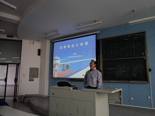 10月9日学院邀请外国语学院院长曹进教授在10A216教室給2013级空中乘务专业170余人上专业导引课《空乘职业与前景》。曹院长从空乘专业学生成长与外语学习相关知识入手进行讲授,并和172名新生进行了深入互动。曹教授授课高屋建瓴、全面透视、语言幽默,现场学子深受教益。