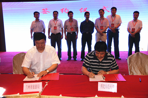 在兰州旅游发展研究中心签约仪式上,兰州市旅游局党组书记、局长唐伟尧与学院院长把多勋签订了兰州旅游发展合作协议。