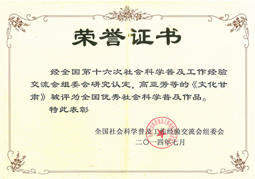从全国第十六次社会科学普及工作经验交流会获悉,金宝搏官网高亚芳教授编著的《文化甘肃》一书获得全国优秀社会科学普及作品。该书2012年4月由甘肃教育出版社出版,全书以甘肃山水形胜的地理单元为背景和舞台,以甘肃历史文化的形成时间为纵向轴线,将全省从伏羲女娲一画开天的始祖文化到周先祖文化、秦早期文化、彩陶文化、敦煌文化、长城文化、简牍文化和现当代红色文化等甘肃在华夏文明史上具有代表意义的文化单元和类型进行了梳理、展示和价值再现,对当代甘肃省为全世界贡献的《读者》、《大梦敦煌》等文化品牌也进行了文化特色和价值阐释,既是对华夏文明在甘肃的特色资源的整理、挖掘,也是对甘肃文化价值的展示、宣传教育和普及,进一步增强全省人民对本省“历史文化厚重,是中华民族重要的文化资源宝库,发展潜力巨大”的文化省情的自豪感和认同感,激发全省建设文化大省,建设华夏文明传承创新区的积极性和主动性,为全省经济社会发展做出贡献。