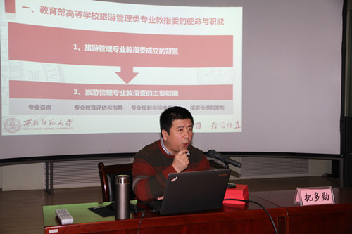 11月14日下午,在七楼导游情景模拟实验室,教育部旅游管理类专业教育指导委员会委员、学院院长把多勋教授作了题为《高等学校旅游管理类专业国家标准释义--中国旅游管理高等教育现状、问题与发展趋势》的专题报告会。学院全体教工、全体研究生和旅游管理(卓越班)本科生120余人参加了报告会。