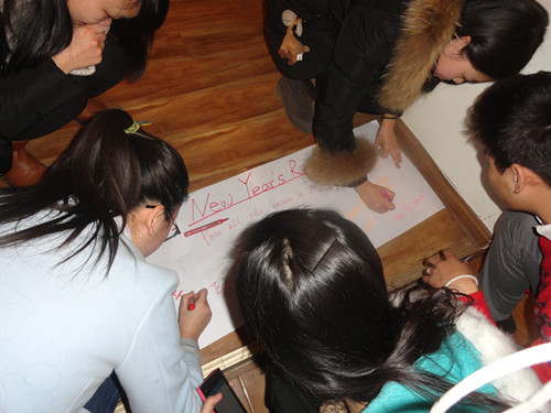 活动主要有两个环节,第一环节由马良相同学主持,在场同学以“Things you can't forgoet about in 2014 or things you want to do in 2015”为话题,展开了愉快的交流和讨论,现场气氛热烈。同学们还在准备好的New Year’s Resolution的白纸上写下了他们的新年愿景。随后的游戏环节由肖涵同学主持,在“Match game”这个游戏中,每个同学有一个身份,需要通过交流寻找和自己“配对”的身份,比如“猫”和“老鼠”是一对,“米奇” 和“米妮”是一对。时间一分一秒地过去,经过愉快的相处和热烈的的讨论后,在“Two truth one lie”游戏环节全场的气氛更加活跃,所有的参与者都乐于其中。到场的每一位外国留学生都感受到了188BET金宝搏官网学生学习英语的热情和说英语的风采。不知不觉,时间接近21点,在“Free talk”畅所欲言环节之后接近尾声。活动最后,何田田老师对同学们的表现称赞不已,进行了简单总结并留下寒假任务,希望同学们在假期不忘英语学习,寻找同城说英语的外国人进行对话并用照片记录下你们的勇敢行为等。