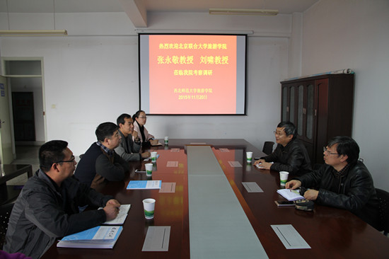 11月20日上午,北京联合大学188BET金宝搏官网科学技术科与研究生处处长张永敬教授、刘啸教授到学院调研。学院党委书记贾志斌、院长把多勋教授、副院长梁旺兵教授、文化产业管理系主任王力等在文化产业管理系办公室参加调研座谈会。