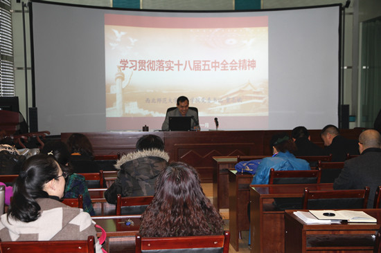 贾志斌书记首先就十八届五中全会从会议召开的情况,重点就全会审议通过的《中共中央关于制定国民经济和社会发展第十三个五年规划的建议》的内容从建议案的意义、指导思想、坚持的原则、主要目标和发展理念几个方面进行了讲解,还就大家关注的“新常态”、“经济中高速增长”、“同步实现小康和扶贫脱贫”、“城镇化率”、“两孩政策”“发展理念——创新、协调、绿色、开放、共享”六大热点问题对比全国和甘肃的实际进行了重点解读。