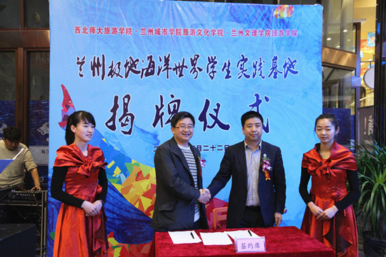 4月22日上午,金宝搏官网和兰州城市学院旅游文化学院、兰州文理学院188BET金宝搏官网与甘肃建荣文化旅游发展有限公司共同签订了校企合作协议书,并在甘肃建荣文化旅游发展有限公司旗下的兰州极地海洋世界进行了本科生专业实践基地挂牌仪式。