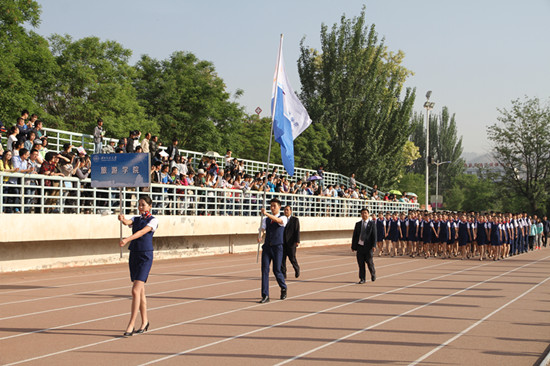 在5月11日上午的入场仪式上,金宝搏官网全体教工和2015级音乐表演(空中乘务方向)80名本科生组成的方队在党委书记贾志斌、院长把多勋的带领下,昂首阔步,英姿飒爽的走过主席台,整齐划一的方队赢得了在场观众的阵阵掌声。