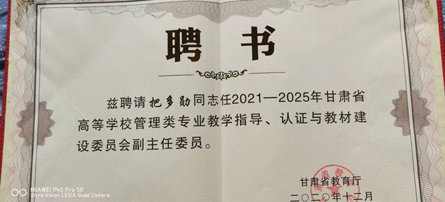 院长把多勋教授被聘任为甘肃省高等学校管理类专业教学指导、认证与教材建设委员会副主任委员