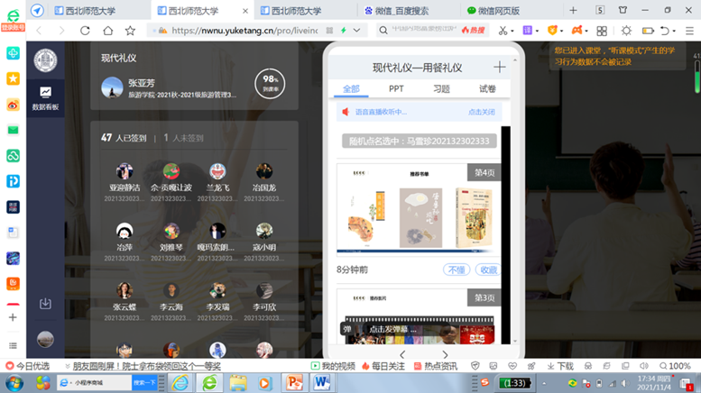 学院开展在线教学两周来,全体任课教师认真负责、勤谨敬业,保证了各门课程线上教学的顺利开展。在此过程中,齐颖新老师讲授的《文化人类学》、张亚芳老师讲授的《现代礼仪》和《酒店人力资源管理》等课程得到了学校教学督导老师的肯定与表扬。学院围绕确定的各年级、课程线上教学实施方案,从保障教师高质量授课、促进学生有意义学习和营造良好师生互动氛围等方面积极开展工作,取得了良好的线上教学效果。