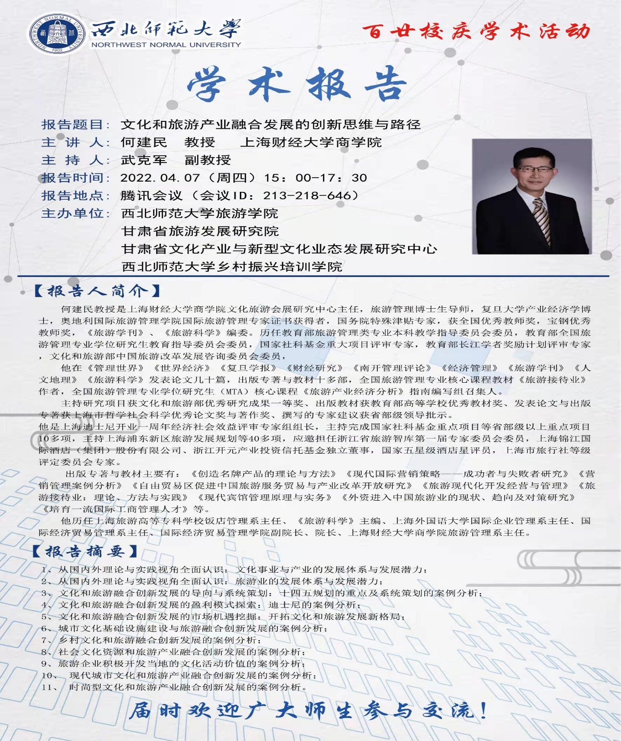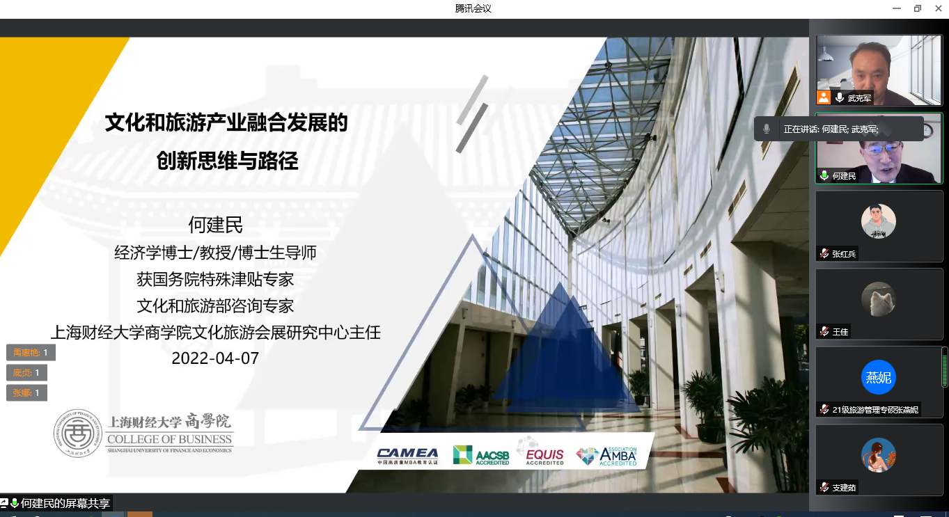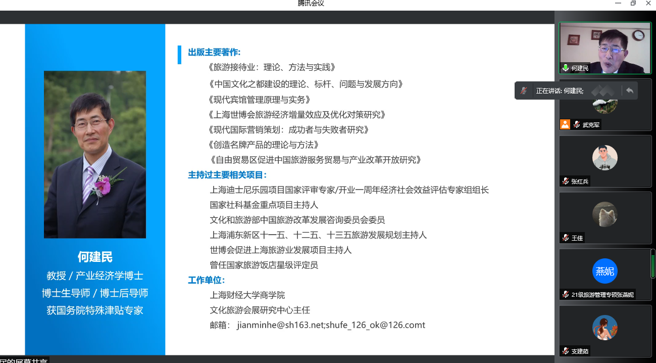 2022年4月7日下午,应学院邀请,上海财经大学商学院教授、博士生导师何建民教授为金宝搏官网师生作了题为“文化和旅游产业融合发展的创新思维与路径”的学术报告,报告由武克军副院长主持,学院师生约300人参加了报告会。