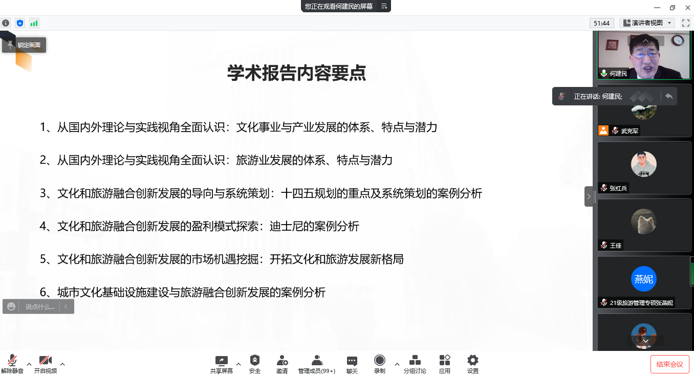 报告会上,何建民教授从国内外理论与实践视角全面认识:文化事业与产业的发展体系与发展潜力;从国内外理论与实践视角全面认识:旅游业的发展体系与发展潜力;文化和旅游融合创新发展的导向与系统策划:十四五规划的重点及系统策划的案例分析;文化和旅游融合创新发展的盈利模式探索:迪士尼的案例分析;文化和旅游融合创新发展的市场机遇挖掘:开拓文化和旅游发展新格局;城市文化基础设施建设与旅游融合创新发展的案例分析;乡村文化和旅游融合创新发展的案例分析;社会文化资源和旅游产业融合创新发展的案例分析;旅游企业积极开发当地的文化活动价值的案例分析;现代城文化和旅游产业融合创新发展的案例分析和时尚型文化和旅游产业融合创新发展的案例分析等11个方面进行了相关的分享和交流。