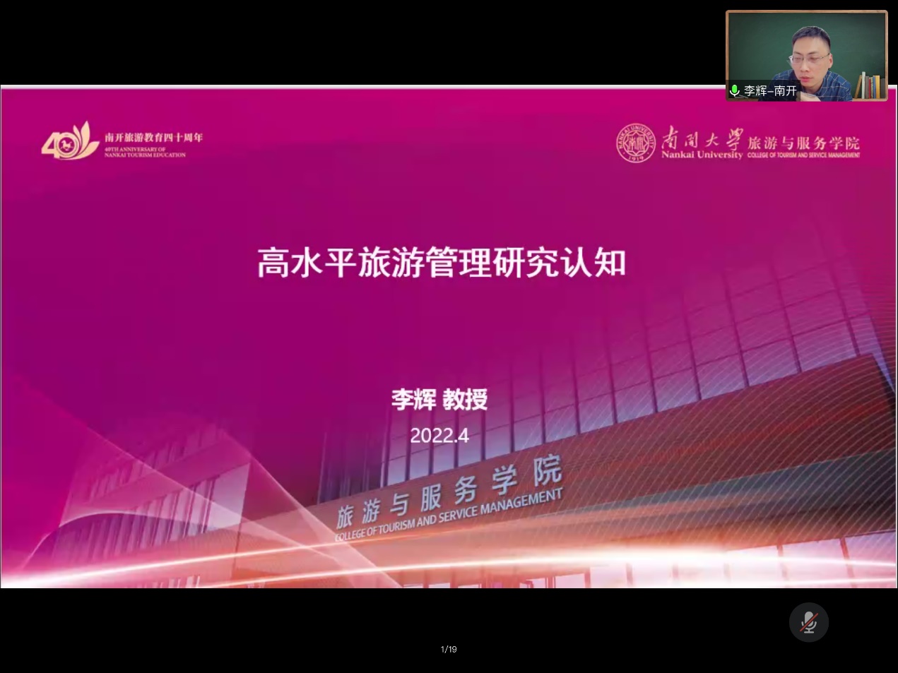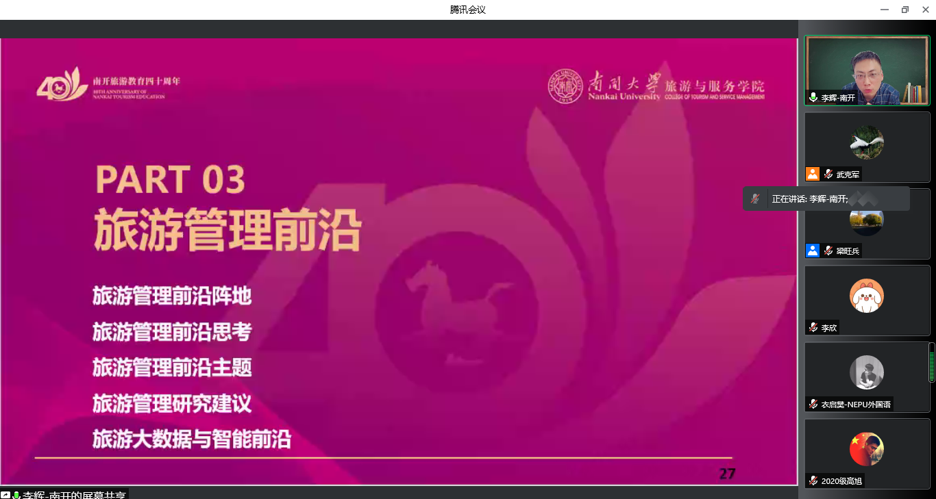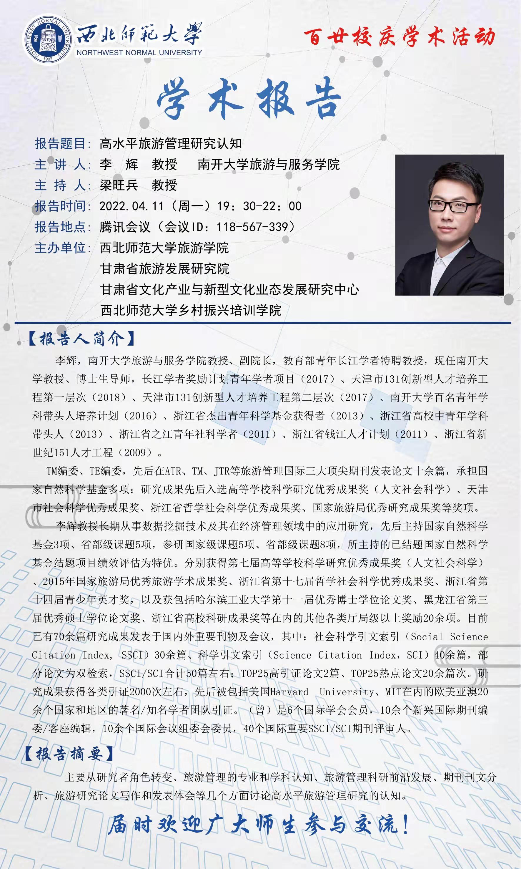 2022年4月11日晚上,应学院邀请,南开大学旅游与服务学院副院长、博士生导师、教育部青年长江学者李辉教授为金宝搏官网师生作了题为“高水平旅游管理研究认知”的学术报告,报告由梁旺兵院长主持,学院师生约350人参加了报告会。