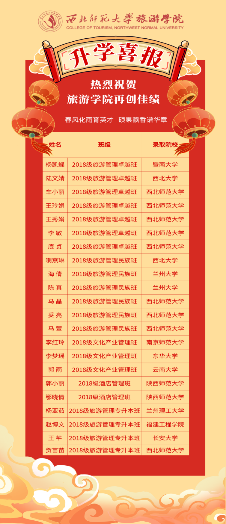 梅花香自苦寒来,宝剑锋从磨砺出。旅院学子用奋斗谱写出自己的精彩华章,用汗水与努力浇灌出成功之花。188BET金宝搏官网多年来一直坚持以考研为抓手组织学风建设,积极推进服务学生发展机制,强化发展引导和文化育人。组织召开考研动员大会、考研复试指导及调剂咨询座谈会、优秀学生代表考研经验分享会,为考研学子发放暖心大礼包,疫情封控期间为学生协调复试场地等,学院用实际行动积极鼓励学生考研,大力营造考研氛围,为学生全方位发展创造良好的环境。在学院领导、专业导师和辅导员老师的全方位支持和细致化服务下,金宝搏官网考研上线率不断提高。