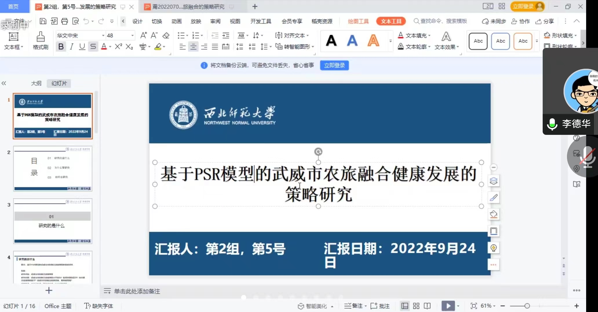 (四)张媛同学从确定选题、开题内容(研究背景、目的及意义;文献介绍;国内外的研究综述;研究思路;研究内容;研究方法)以及注意事项(研究方法要合适;文献综述要全面;案例地选择具有代表性和典型性;研究对象要明确;理论基础;相关概念界定要清晰;写作大纲逻辑要清晰;附调查问卷)三个方面展开分享。