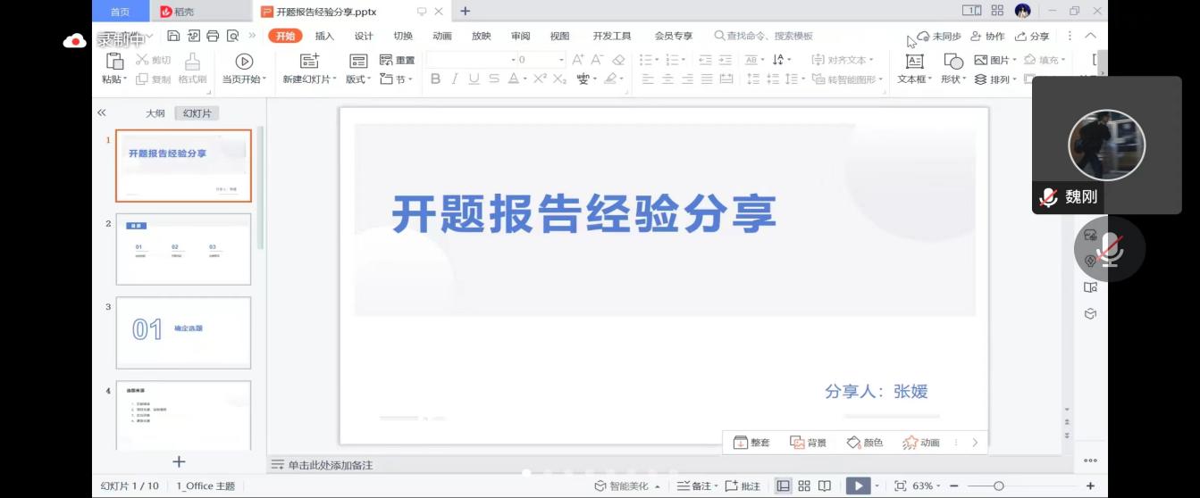 首先武克军老师就本次会议做了简单介绍,张媛同学依次介绍参会领导和团队老师,并汇报会议基本流程。会议包括三个部分,首先由焦慧等四位同学分享开题经验、其次自由提问互动交流环节与老师的点评,最后会议总结。