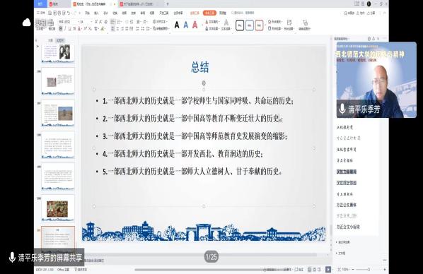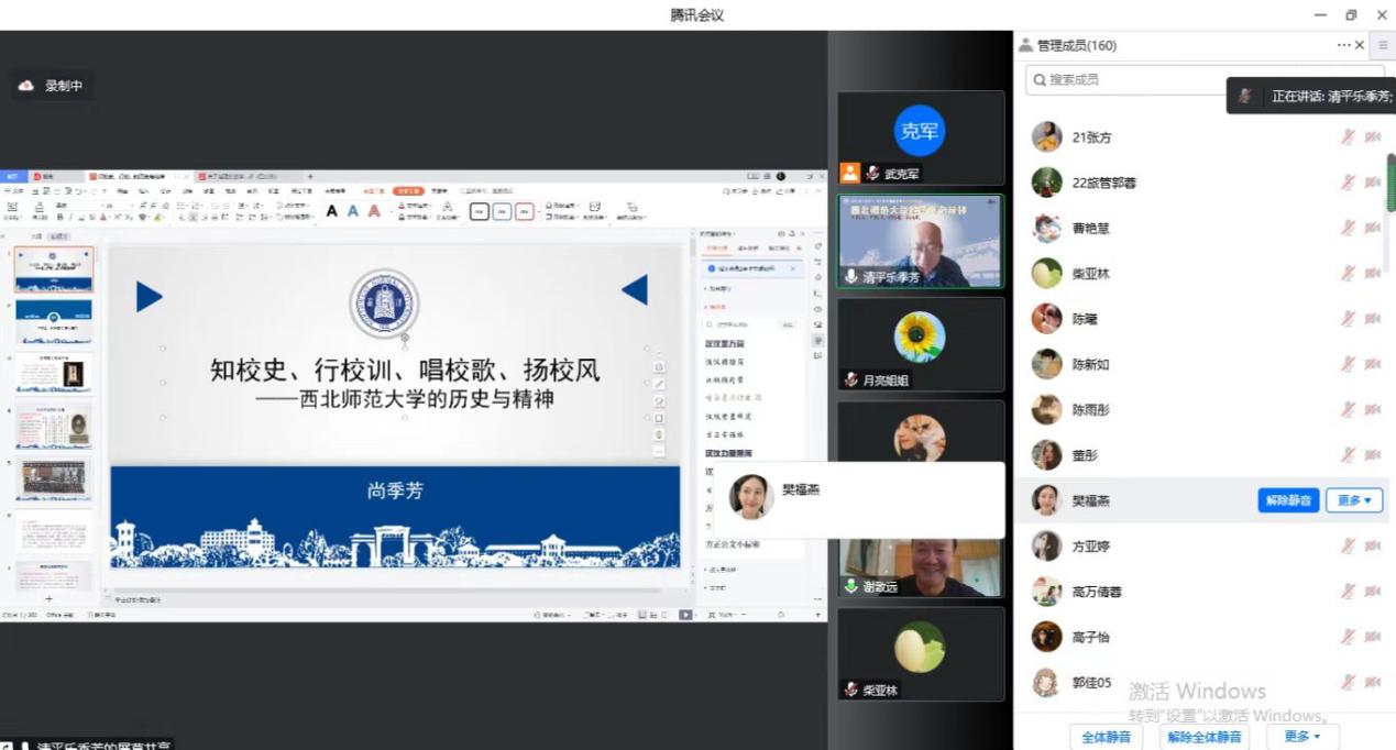 丝路传薪双甲子,长河振铎百廿载。值188BET金宝搏官网120周年校庆之际,金宝搏官网特邀历史文化学院博士生导师,学报编辑部主任、校史研究中心主任,国家社科基金重大项目“抗战时期西北国际通道资料整理与研究”首席专家尚季芳教授于11月3在线为188BET金宝搏官网全体师生开展“188BET金宝搏官网的历史与精神”专题讲座。此次报告会由学院党委书记谢致远同志主持,学院所有教师以及学生260余人参加了听讲。通过此次讲座让全体师生再次重温学校辉煌过去与见证新成就,进一步提高师生的积极性和凝聚力,为新征程启航而不懈奋斗!