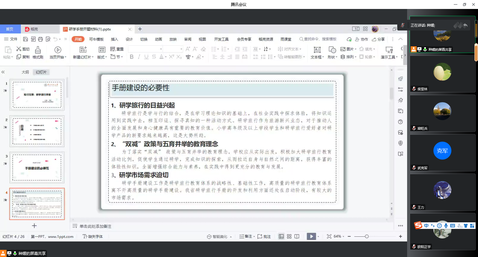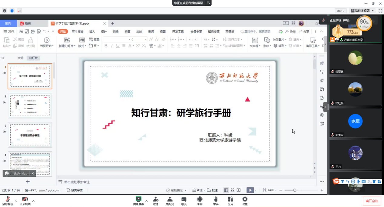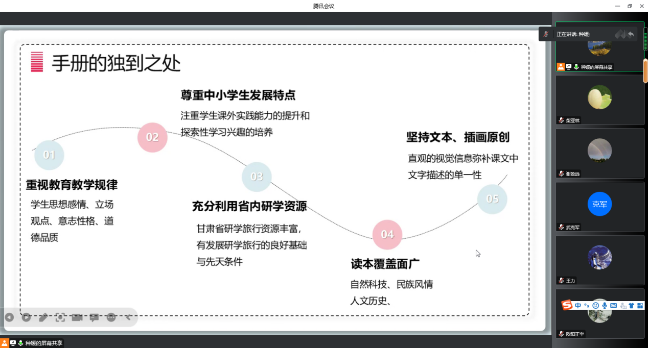 会议开始,种媛副教授对该教材的编著背景和必要性、编写思路和教学大纲、教材特色和创新以及编写面临的困惑做了全面的介绍汇报。该教材主要面向中小学生,尝试通过对甘肃省研学旅游资源的梳理与分类,构建甘肃省研学体系和实践手册,使中小学生通过亲近和探究自然,接触和融入社会,关注和反省自我,体验和感受集体生活,使中小学生在自然中探索、在社会中实践、在活动中学习,并养成价值认同、实践内化、身心健康、责任担当等意识=能力。