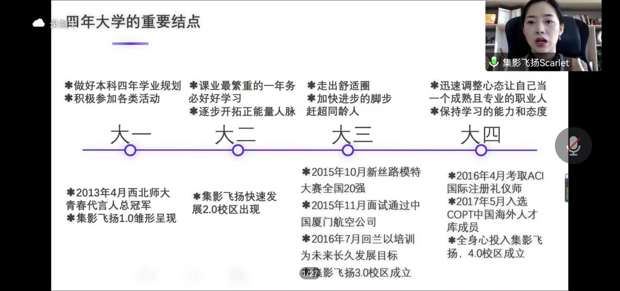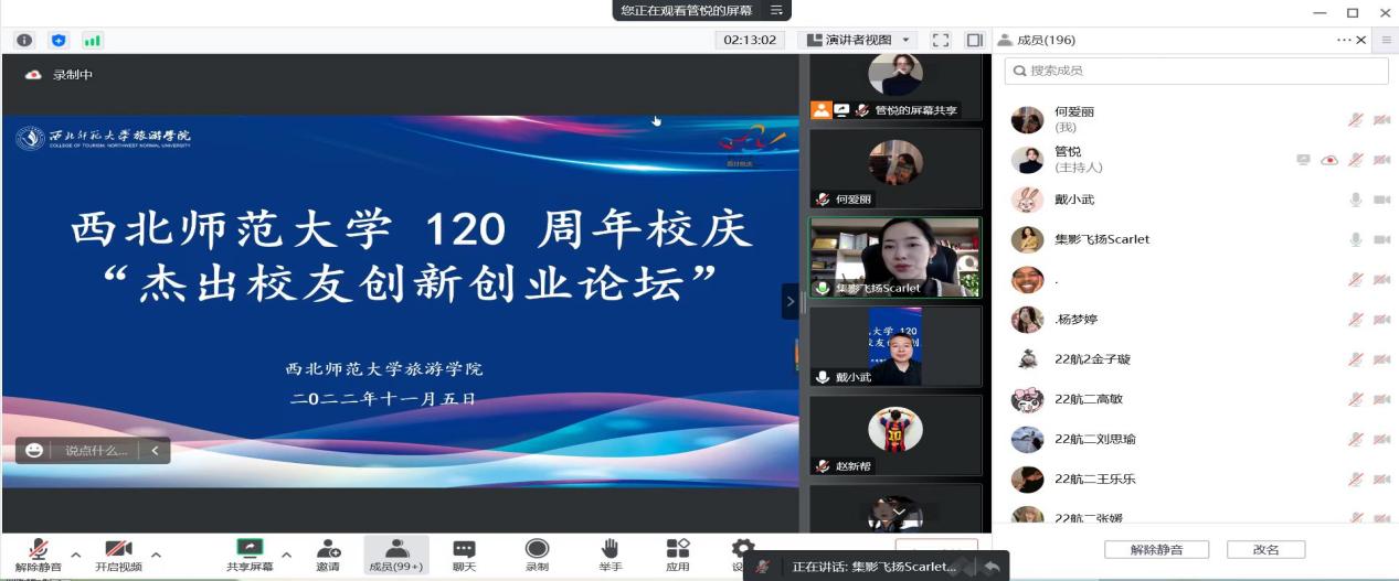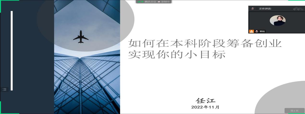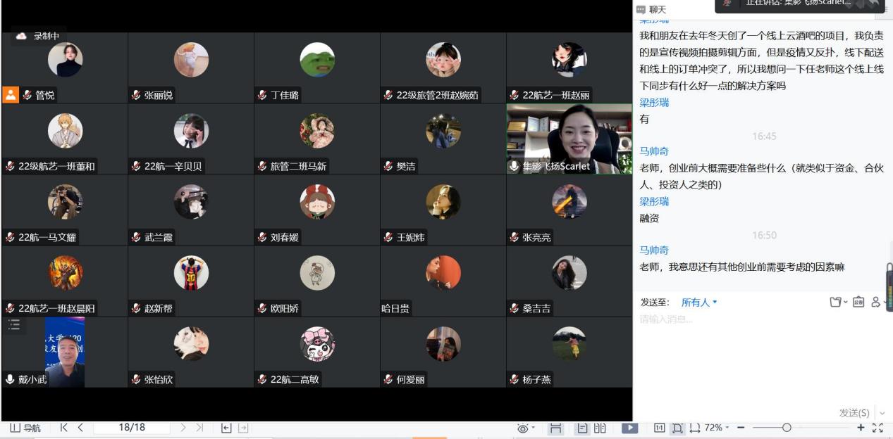 2022年11月5日,188BET金宝搏官网线上开展百廿校庆“杰出校友创新创业论坛”报告会。2017届空中乘务专业校友、“集影飞扬”创始人任江应邀出席,并作题为“如何在本科阶段筹备创业,实现你的小目标”就业创业专题报告。学院副院长王力、党委副书记戴小武和专职辅导员线上参会,2022级全体新生、部分二、三年级本科生聆听报告并积极讨论交流。
