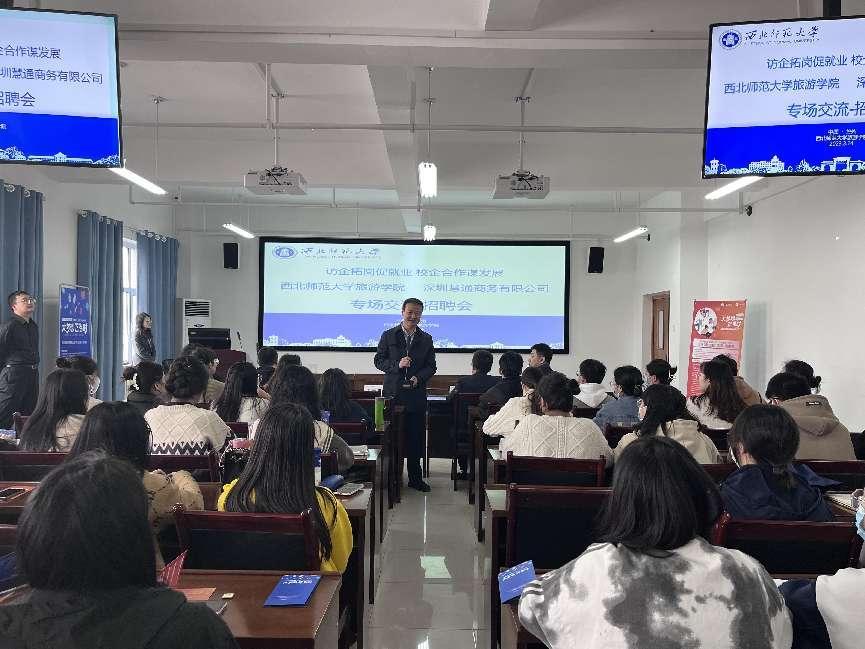 3月14日下午,188BET金宝搏官网开展“访企拓岗促就业 校企合作谋发展”系列活动暨深圳慧通商务有限公司(华为全资子公司)专场交流招聘会,华为终端BG MSS大中华甘肃终端业务部HRD李昱松、甘肃终端业务部直营小区经理王方一行8人应邀来金宝搏官网进行专场交流招聘宣讲活动,188BET金宝搏官网党委书记谢致远、党委副书记戴小武、2023届文化产业管理班班主任冯玉新,辅导员鲁梦鸽、赵新帮、李敏以及2023届188BET金宝搏官网全体毕业生参加此次交流招聘会。