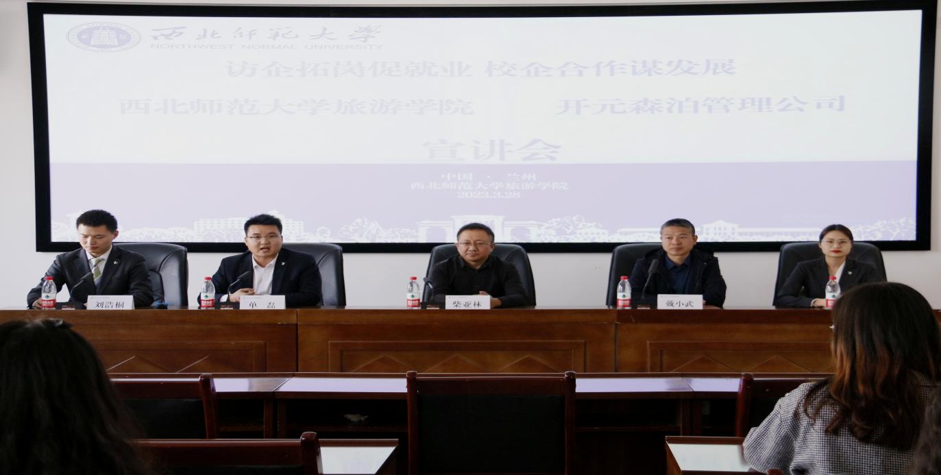 会上,单磊从企业概况、企业文化、职业发展方向、管培生晋升机制四个方面进行了详细讲解。通过分享2022届旅游管理专业毕业生司亚亚的切身经历和职业发展,让同学们对开元森泊有更加深入的认知和了解。他表示开元森泊急需大量专业管理型人员,希望通过合作培养旅游管理型人才,加强与学院的合作与交流。
