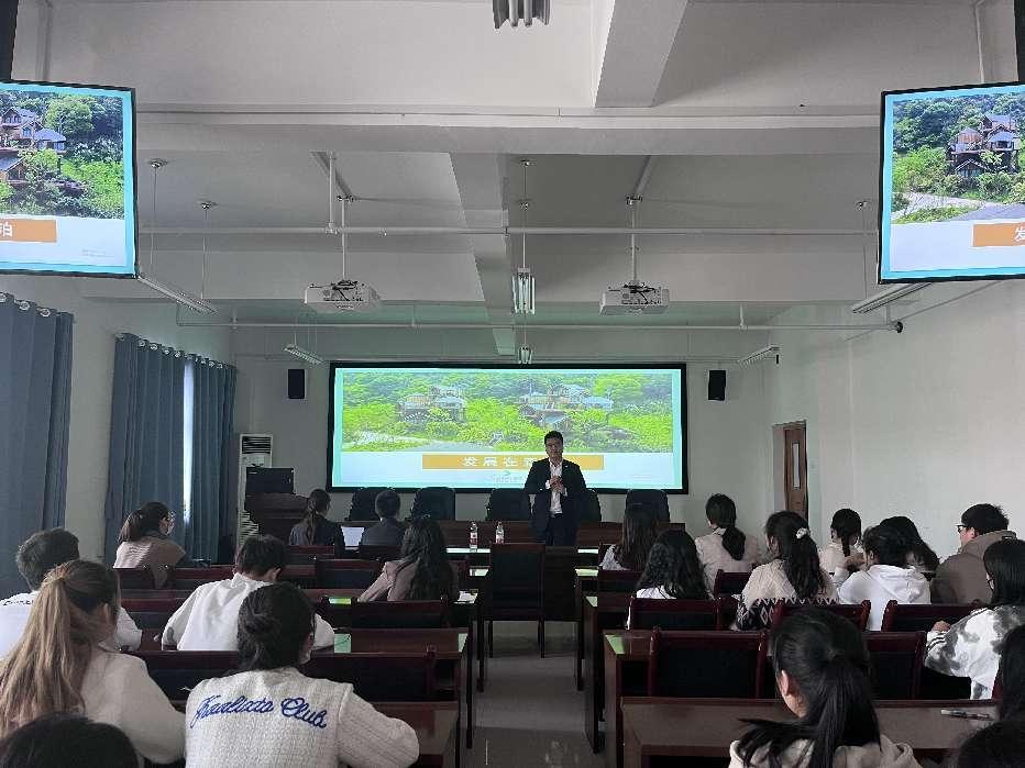 会上,通过现场提问的方式,单磊针对同学们提出的如何有效度过大学时光、旅游管理专业未来发展方向等问题,为同学们进行排疑解惑,帮助同学们树立目标意识和规划意识。开元森泊度假乐园管培生黄静梅、刘浩桐分享了自身工作经历、心路历程。