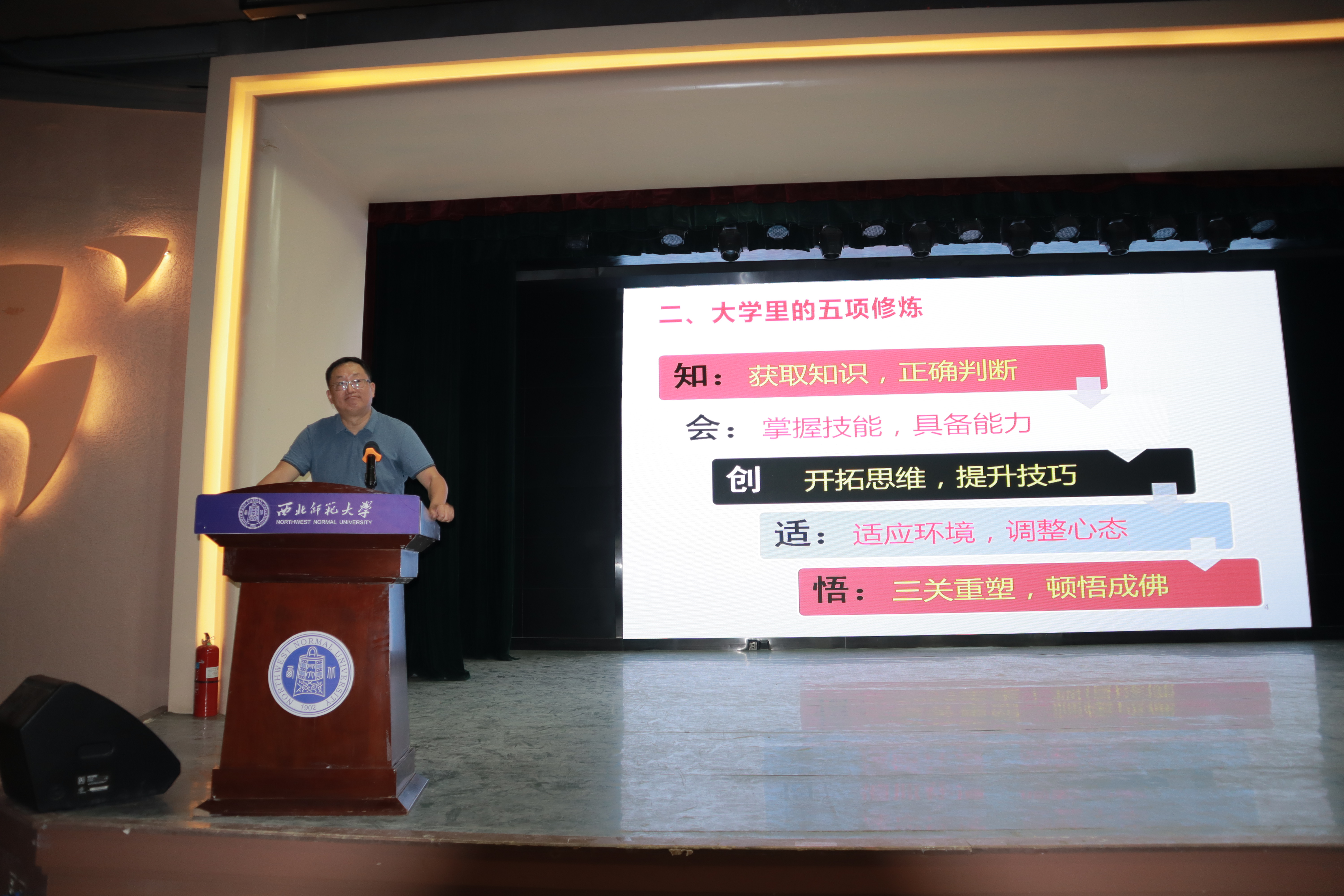 梁旺兵对新同学的到来表示衷心祝贺,感谢其为学院发展注入了新鲜血液,在介绍了学院发展历程、学科专业设置和科研成果等情况后,对同学们的发展提出三点建议,一是要适应多学科融合的专业发展趋势,将兴趣融入专业学习中;二是适应大学生活,建立良好的作息习惯;三是要学会学习,掌握科学有效的学习方法,真正做到“预设精彩、创设未来”。