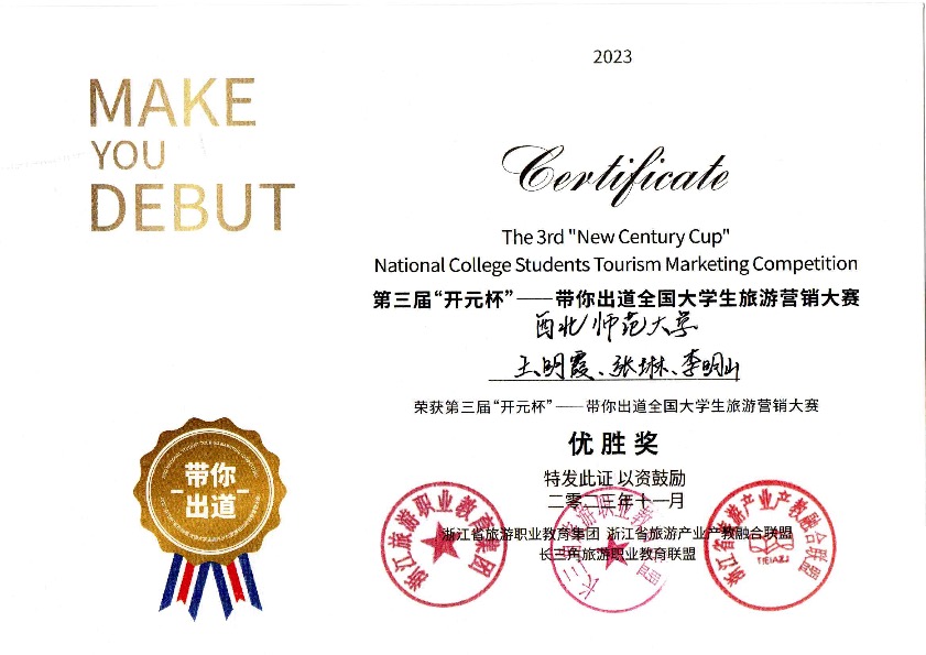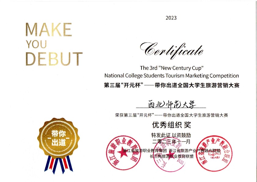 金宝搏官网多支队伍在专业实践中心的组织下参加了第三届“开元杯”——带你出道全国大学生旅游营销大赛的初赛及复赛,最终金宝搏官网2022级旅游管理1班王明霞、张琳及其队员荣获优胜奖,金宝搏官网荣获优秀奖组织奖。