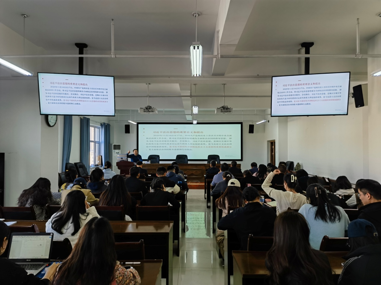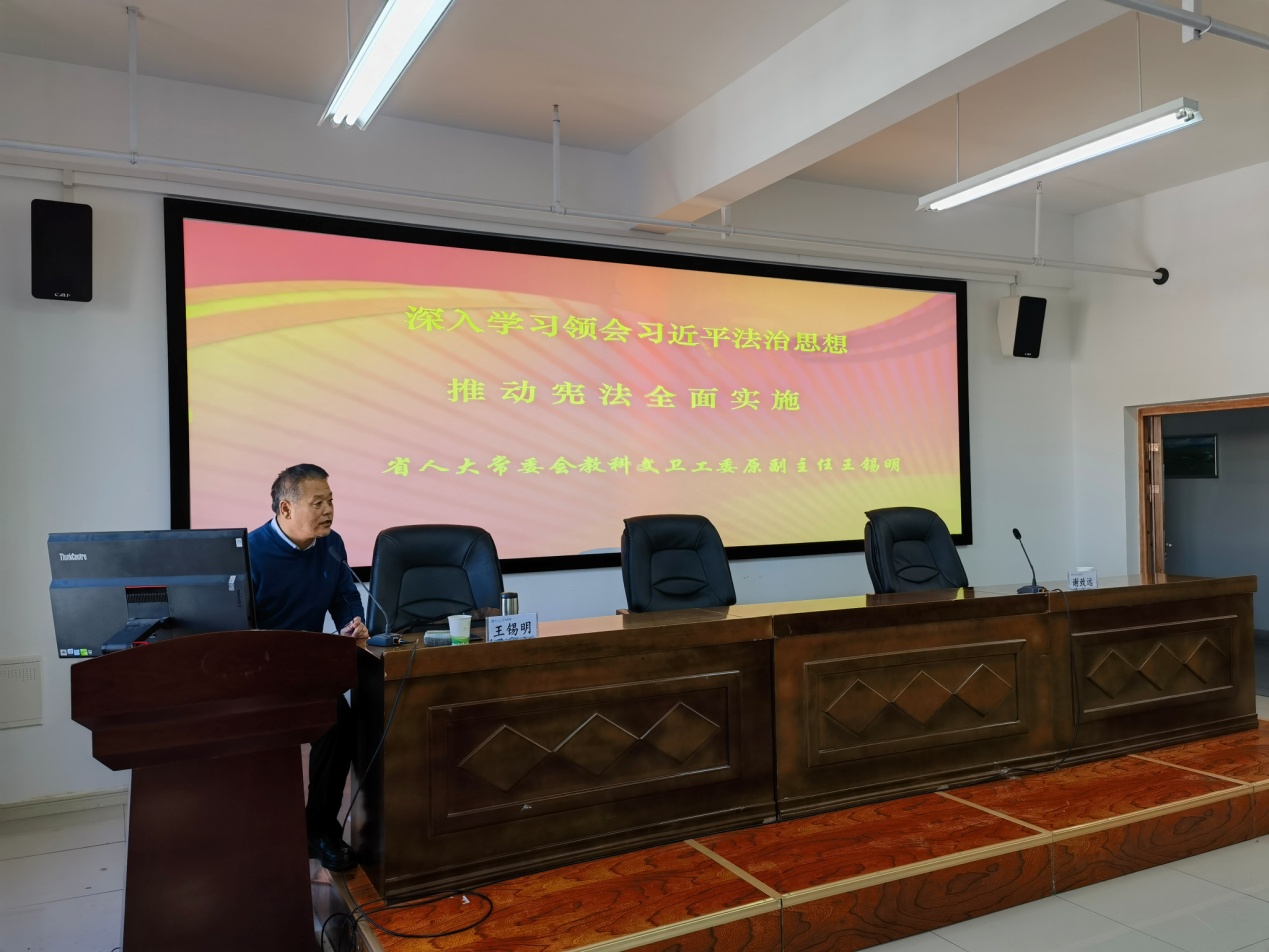 王锡明从习近平法治思想的重要意义和提出、习近平法治思想形成的历史背景、习近平法治思想的主要内容、维护宪法权威、推动宪法全面实施等八个方面生动诠释了政治理论知识。通过这次讲座,师生在学习领会习近平法治思想、认识我国宪法的深厚底蕴、实践根基、优势功效等方面有了更深层次的认识,把切实尊崇宪法,严格实施宪法提高到一个新水平。