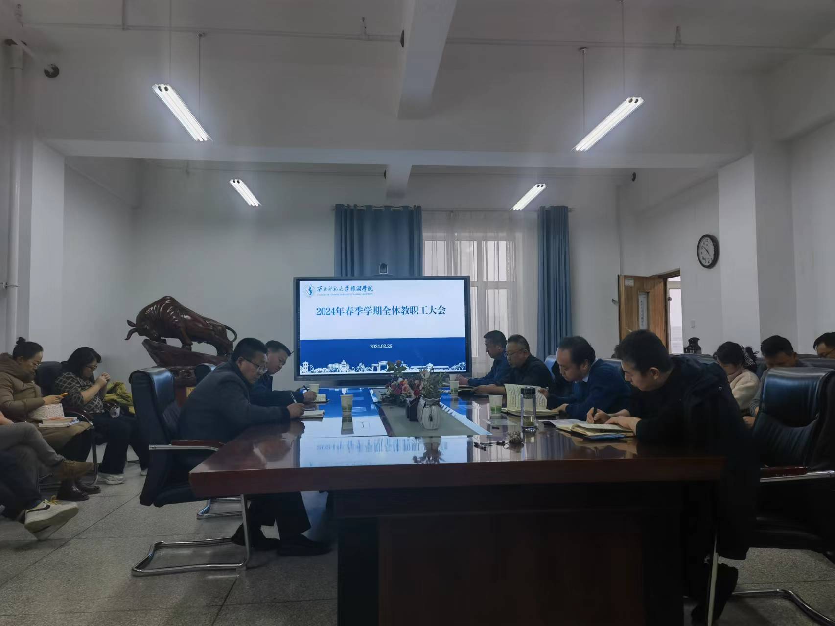 会上,教职工听取了学校2024年工作安排和要求。学院领导班子成员结合分管工作与学校工作要求,分别从本科生教学、研究生教学、本科教育教学审核评估工作、课程与专业建设、科研工作、社会服务工作、心理健康教育、学生管理与安全工作做出了具体要求,对学院2024年重点工作做出具体安排。