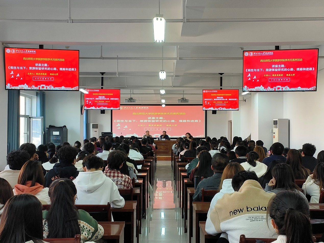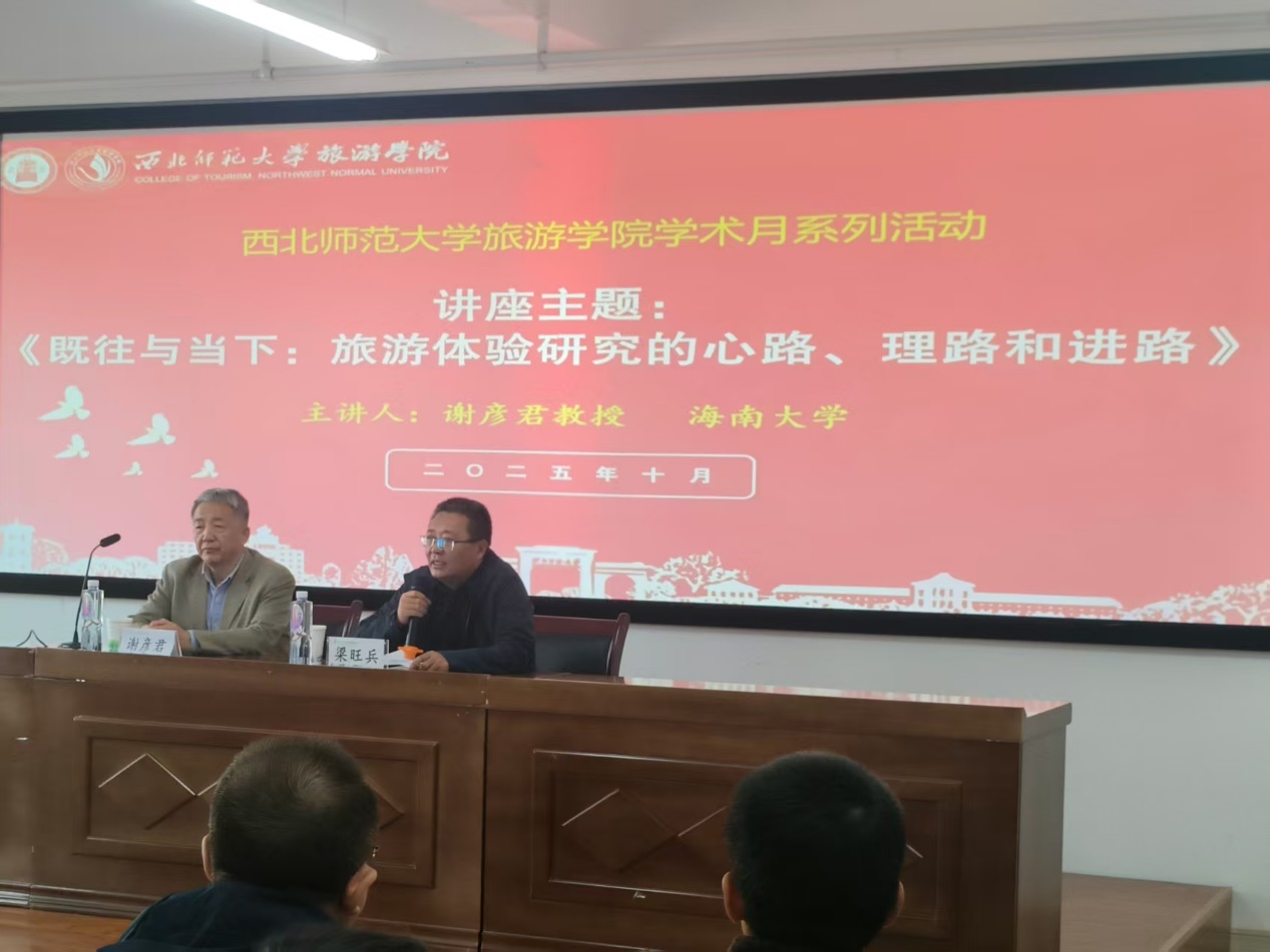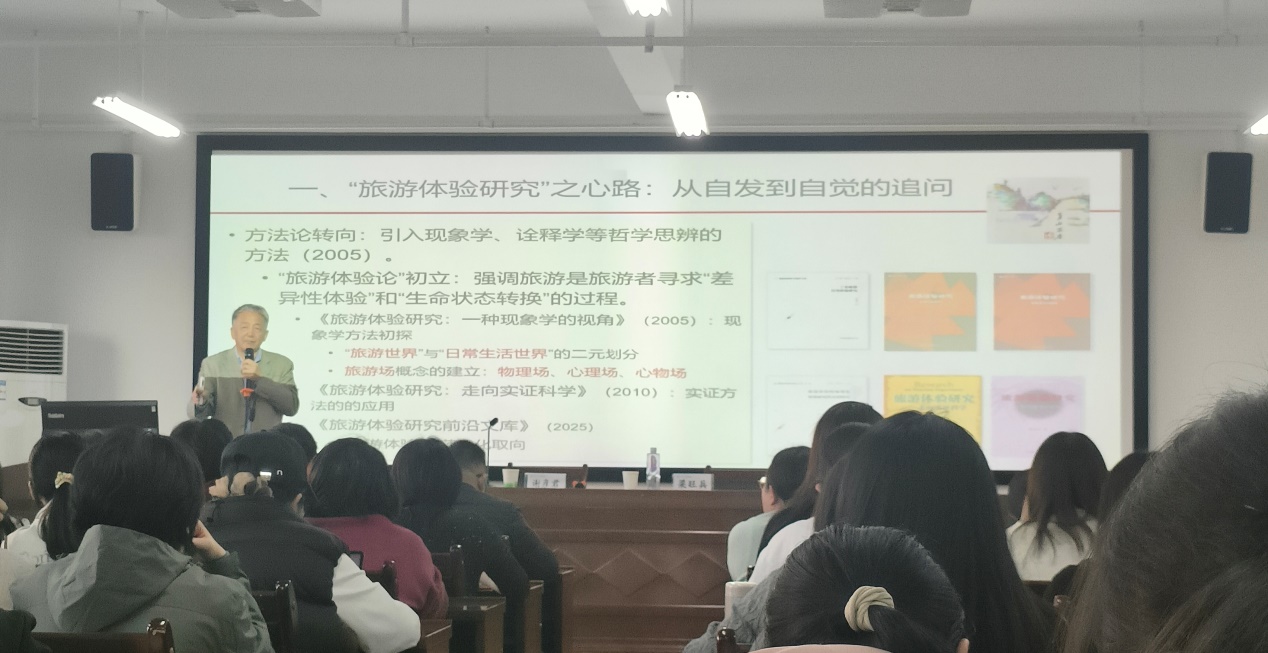 10月28日,为进一步提升188BET金宝搏官网研究生科研能力与专业素养,深化对旅游学科领域前沿认知,推进研究生培养高质量发展。金宝搏官网开展学术月系列活动之“既往与当下:旅游体验研究的心路、理路和进路”学术报告,邀请了海南大学二级教授、博士生导师、《旅游学刊》副主编、文化和旅游部中国旅游研究院学术委员会副主任、中国旅游研究国际联合会(IACTS)创会会士谢彦君主讲。报告会在文科实训楼904会议室举办,由188BET金宝搏官网院长梁旺兵主持,相关专业老师和全体研究生聆听此次报告会。