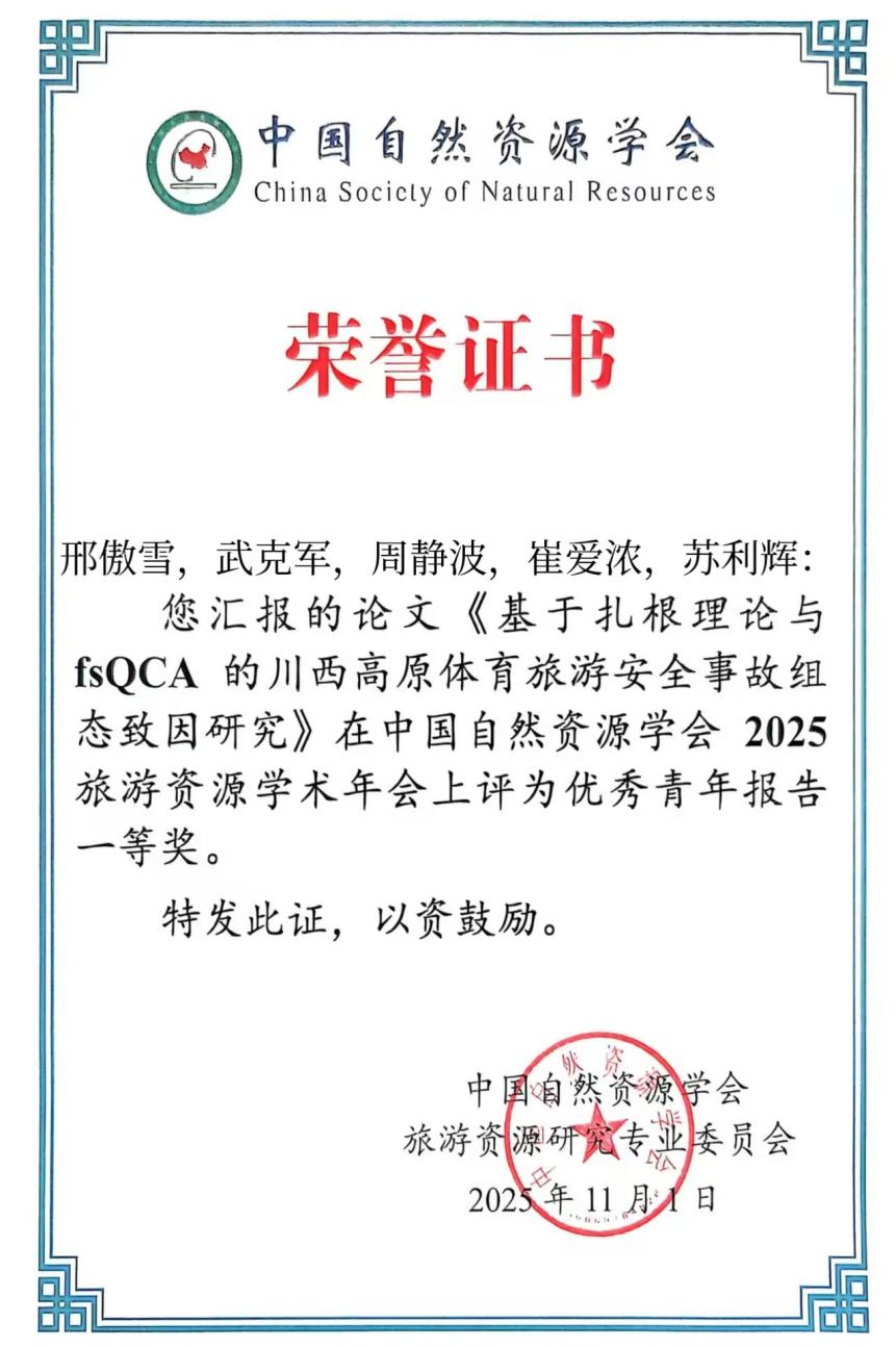 近日,金宝搏官网武克军副教授指导学硕研究生邢傲雪、周静波、崔爱浓和苏利辉共同完成的研究成果《基于扎根理论与fsQCA的川西高原体育旅游安全事故组态致因研究》荣获“中国自然资源学会2025旅游资源学术年会”优秀青年报告一等奖。这项成果是金宝搏官网在旅游安全与风险管理研究领域,深度融合质性研究与量化分析方法的成果之一,彰显了金宝搏官网在运用混合研究方法攻坚旅游安全研究前沿课题方面的探索活力、扎实功底与日益提升的学术影响力。