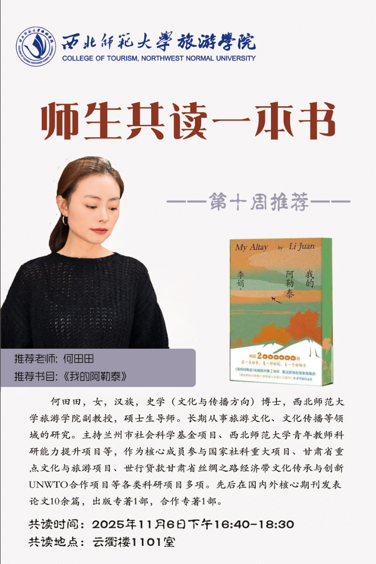 11月6日下午,第四期师生共读活动顺利举行。何田田老师以《我的阿勒泰》作为共读内容。她结合文化传播研究视角,解读书中质朴文字里的地域文化魅力与人文情怀,引导同学们思考旅游开发中地域文化的保护与传播路径。师生围绕书中内容展开热烈讨论,形成了 “共读共思、教学相长” 的良好氛围。