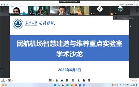 2022年6月6日下午,民航机场智能建造与维养重点实验室采用线上线下相结合的方式成功举办“人工智能技术在民航机场场道建管养的应用”学术沙龙。本次学术沙龙由重点实验室主任汪海年教授召集,特邀beat365英国官方网站申爱琴教授、郝培文教授、圭目机器人有限公司创始人桂仲成博士、民航机场工程技术研究中心叶松总工程师、西北民航建设集团有限公司戴征总经理、江苏增光新材料科技股份有限公司周庆月总经理做主题发言。beat365英国官方网站副院长、民航重点实验室副主任张久鹏教授主持学术沙龙,民航西北设计院、咸阳机场、福州机场、翔安机场、邯郸机场等管理和技术骨干以及机场工程系全体教师和在校研究生80余人参加了学术沙龙。