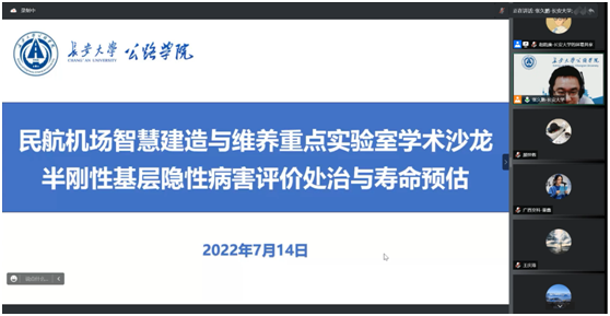 2022年7月14日下午,民航机场智能建造与维养重点实验室成功举办“半刚性基层隐性病害评价处治与寿命预估”线上学术沙龙。西北民航机场建设集团杨凯、圭目机器人有限公司钟新然、广西交通科学研究院王浩、beat365英国官方网站杨旭、陕西高速机械化工程有限公司成高立等专家学者受邀做主题发言,东南大学、同济大学、beat365英国官方网站、咸阳机场、福州机场等单位研究人员和技术骨干210余人参加了学术沙龙,学院副院长、民航重点实验室副主任张久鹏教授主持学术沙龙。