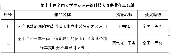 第十七届全国交通运输科技大赛共计177所高校的1473件作品参赛,94所高校共213件作品进入决赛,入围率仅14%。本年度进一步将研究生赛道精细化分为博士生、硕士生两个分赛道,其中博士生赛道全国仅7件作品入围决赛。王朝辉教授指导的作品《面向低碳能源的智能道路压电发电装备研发及应用》在博士生赛道中获得唯一的全国一等奖,这是我校目前在本项赛事研究生赛道中获得的最好成绩。栗培龙教授、丁湛副教授指导的作品《基于“路—车—雨”信息融合的多雨山区高速公路行车实时分析与导引系统》获本科生赛道全国一等奖,这也是继第十四届全国大学生交通运输科技大赛之后,beat365官网师生再一次获得本科生赛道全国一等奖。