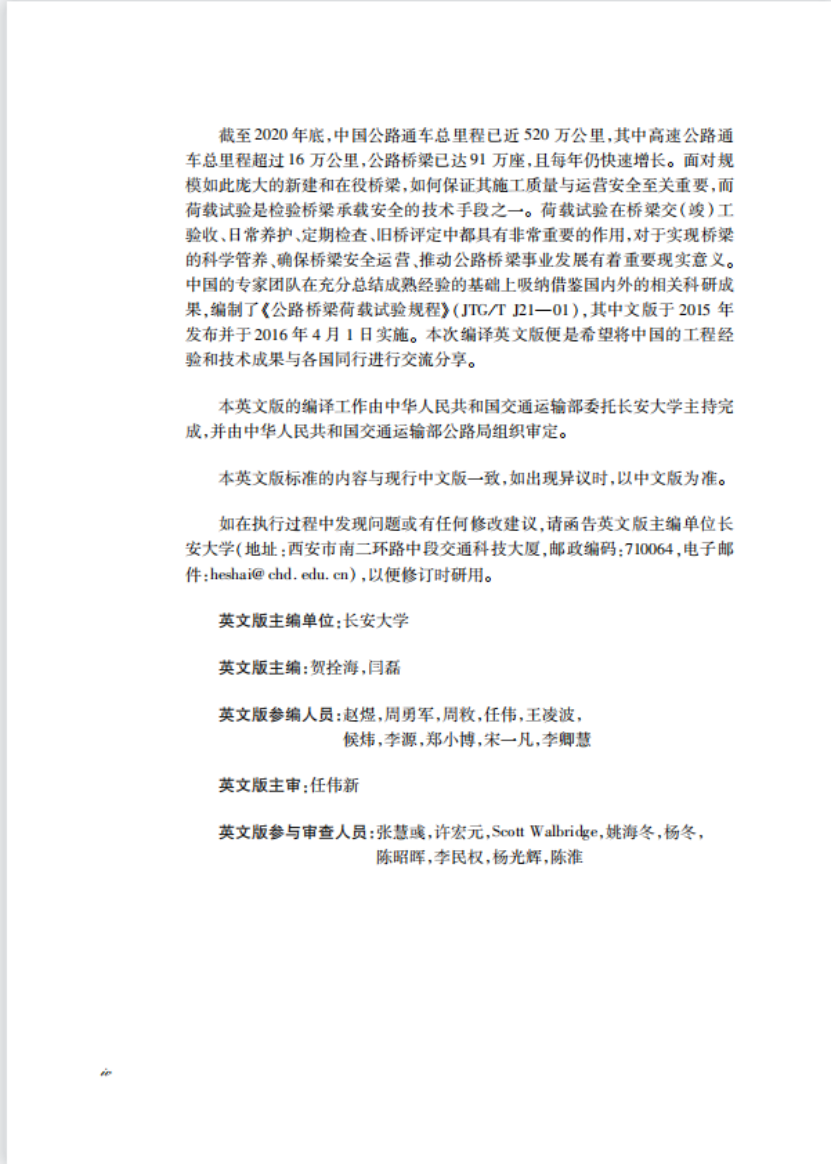 同时由贺拴海教授与闫磊副教授主译的《公路桥梁荷载试验规程》英文版[JTG/T J21-2015(EN)]于2022年1月19日发布。《公路桥梁荷载试验规程》(JTG/T J21-01)中文版由我校主编,于2015年发布并于2016年4月1日实施。本次编译英文版便是希望将中国的工程经验和技术成果与各国同行进行交流分享。本英文版的编译工作由中华人民共和国交通运输部委托beat365英国官方网站主持完成,并由中华人民共和国交通运输部公路局组织审定。