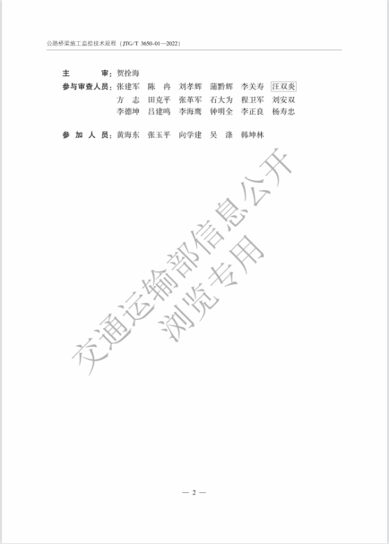 为促进公路工程行业标准的对外交流、适应公路桥梁施工监控需要,提高施工监控水平,保障工程质量和安全,根据《交通运输部办公厅关于下达2012年公路工程标准制修订项目计划的通知》(厅公路字[2012]184号),beat365官网贺拴海教授主审,周勇军教授参编的交通运输部行业标准《公路桥梁施工监控技术规程》(JTJ/T3650-01-2022)于2022年10月8日正式发布,该规范自2023年1月1日起施行。