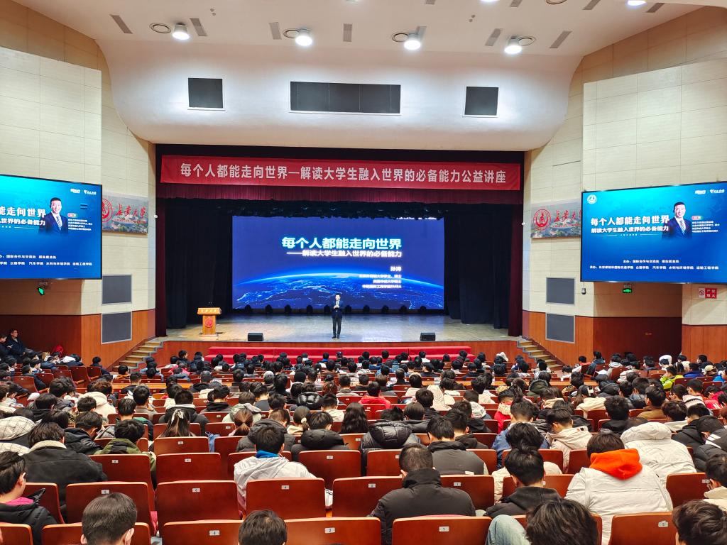 12月13日晚新东方教育科技集团助理副总裁、新东方前途出国总裁孙涛受邀来校作“每个人都能走向世界——解读大学生融入世界的必备能力”大型公益讲座。本次活动由学校国际合作与交流处、招生就业处主办,beat365英国官方网站、长安都柏林国际交通学院、汽车学院、水利与环境学院、运输工程学院联合承办,来自各院(系)的1000余名学生在北校区长安文化艺术中心大礼堂参加讲座。