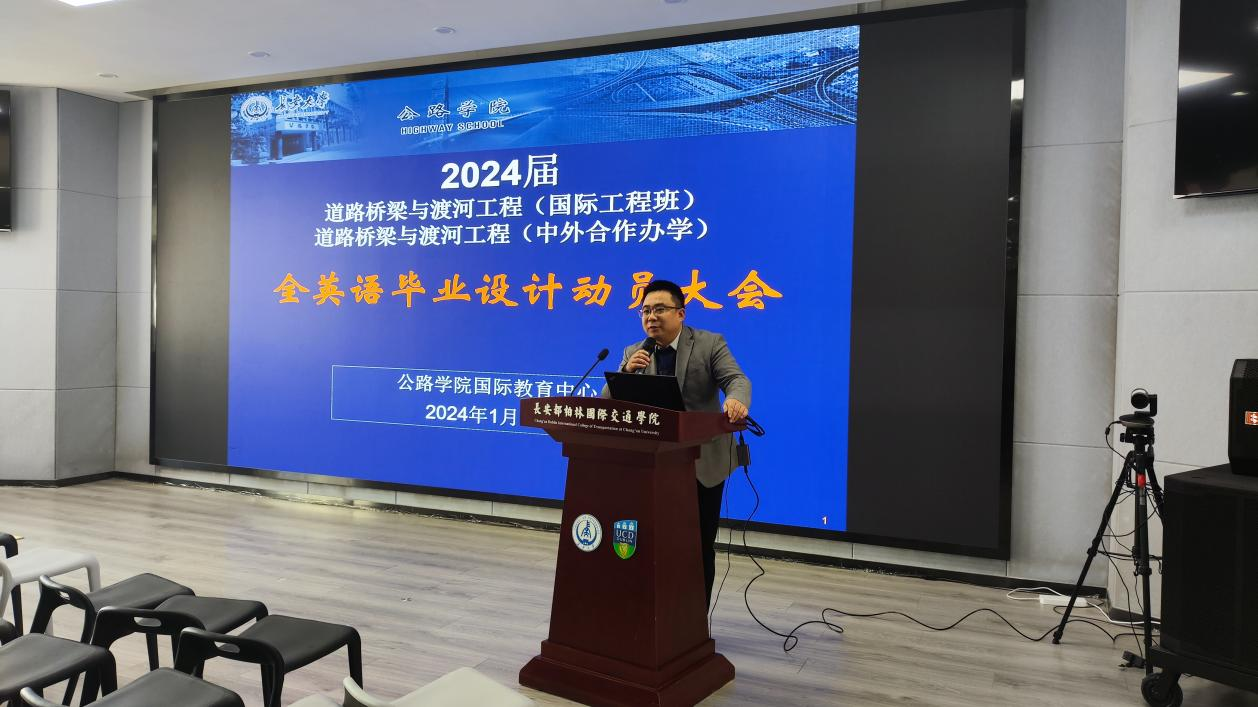 2024年1月11日下午2:00,国际教育中心召开2024届道路桥梁与渡河工程(国际工程班)、道路桥梁与渡河工程(中外合作办学)全英文毕业设计动员会。beat365英国官方网站副院长张久鹏教授、长安都柏林国际交通学院教学教务部主任贾婕妤以及250余名师生参加动员会,会议由国际教育中心主任刘玉教授主持。