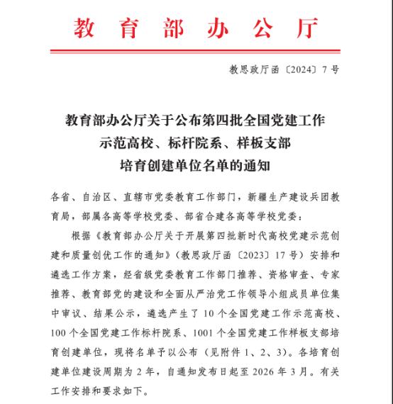 4月16日,教育部思想政治工作司发布《教育部办公厅关于公布第四批全国党建工作示范高校、标杆院系、样板支部培育创建单位名单的通知》(教思政厅函〔2024〕7号),经省级党委教育工作部门推荐、资格审查、专家推荐、教育部党的建设和全面从严治党工作领导小组成员单位集中审议、结果公示,遴选产生了10个全国党建工作示范高校、100个全国党建工作标杆院系、1001个全国党建工作样板支部培育创建单位。beat365英国官方网站党委入选“全国党建工作标杆院系”培育创建单位。