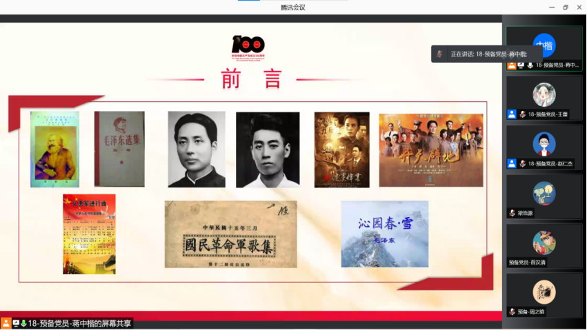 本科生第三党支部于8月6日以腾讯会议形式开展了“五个一百”党史学习教育专题微党课。本次党课由第三党支部副书记张昕同志担任主讲人,第三党支部全体党员、预备党员、发展对象以及入党积极分子参加党课。张昕同志讲述了百名英模人物和百部红色经典图书。介绍了方志敏、蒋诚等英模人物以及红色经典图书——《人民的名义》。