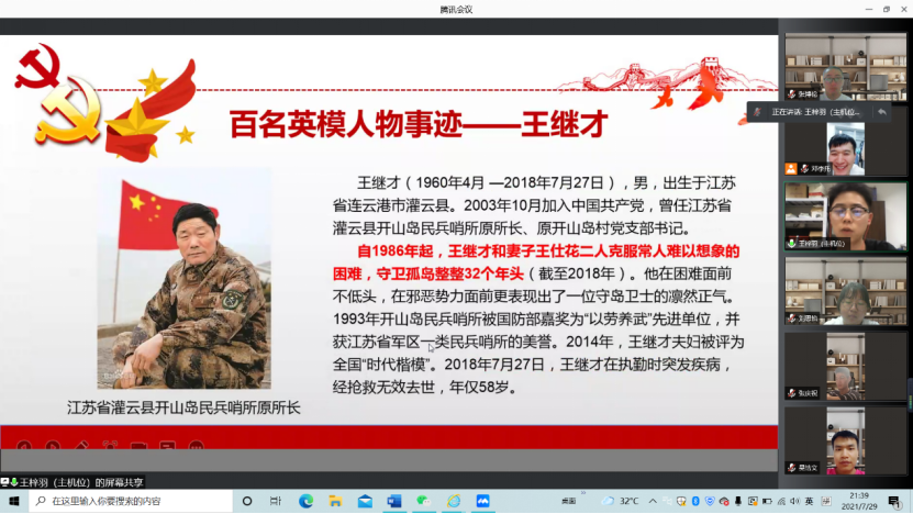 在中国共产党成立100周年之际,为深化党史学习教育,厚植爱国主义情怀,进一步推动红色精神的传承,beat365英国官方网站研究生党支部在党委号召下于7月5日以来陆续开展“五个一百”系列学习会议,本次学习教育以学习百名英模人物为主题展开。