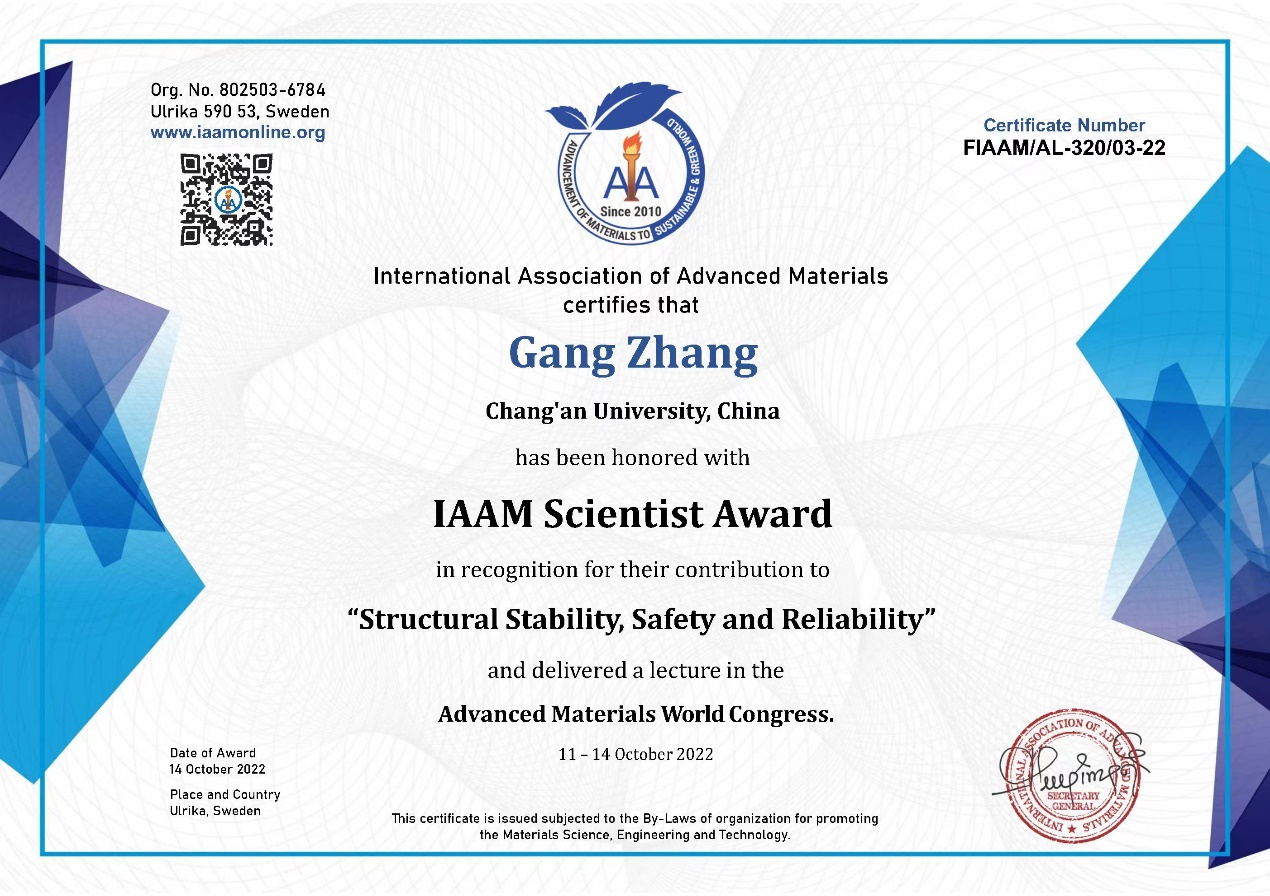 On October 11, Professor Zhang Gang from the School of Highway was invited to give a report entitled "Fire resistance of high-strength steel bridge" at the European Advanced Materials Conference held in Stockholm, Sweden, and won the IAAM Scientist Medal, and was selected as a member of the Executive Committee in recognition of his contribution to the innovative research field of fire-resistant design methods for high-strength steel bridges.