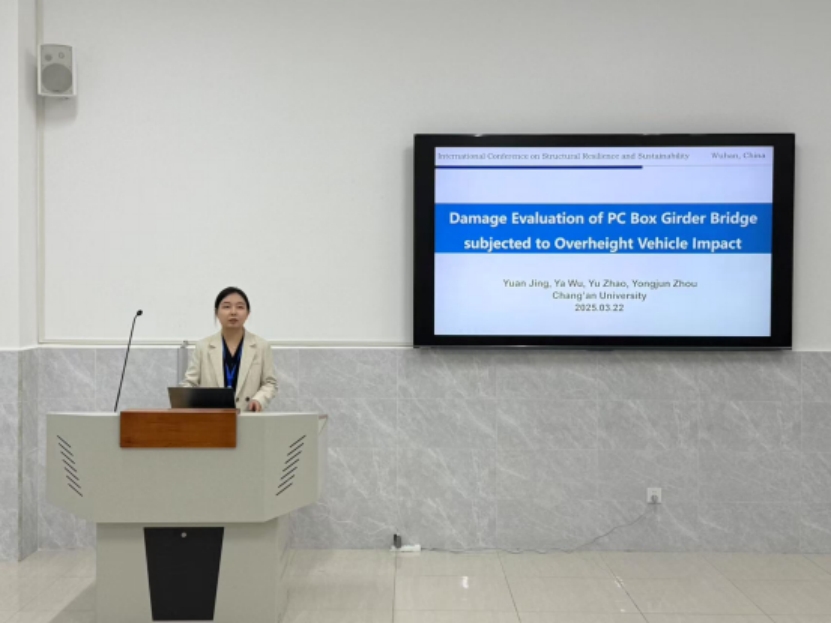 During the conference, Associate Professor Jing Yuan delivered a presentation titled "Damage Evaluation of PC Box Girder Bridge Subjected to Overheight Vehicle Impact." Her report provided a detailed analysis of the dynamic response and damage assessment methods for PC box girder bridges under overheight vehicle collisions, offering critical scientific insights for evaluating the safety performance of bridges in such scenarios and laying a theoretical foundation for impact-resistant design and safety assurance.