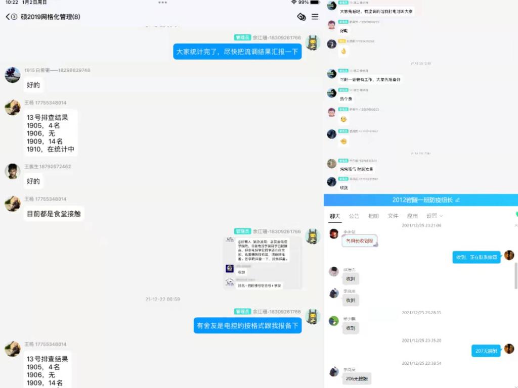 在疫情防控中,处于宿舍制动的党员同学们也通过线上办公,为疫情防控贡献自己的力量。各年级党员及学生干部在学院党委、防疫工作组的带领下建立起疫情防控网格,并在线上承担着年级核酸检测登记情况的摸排工作,同时督促班级同学进行每日健康打卡。