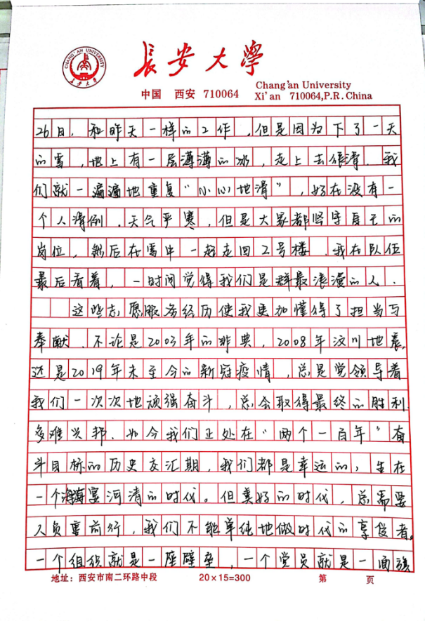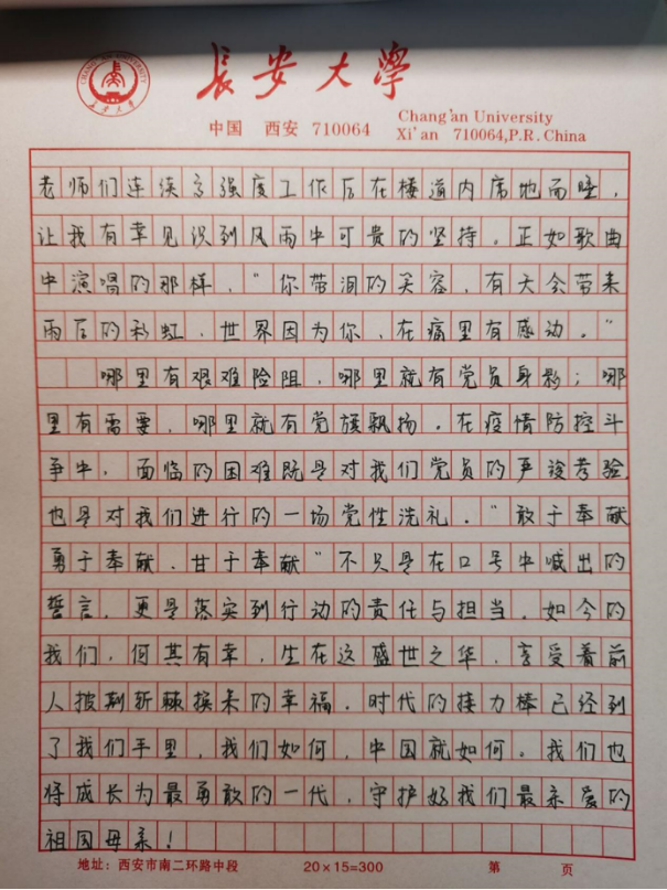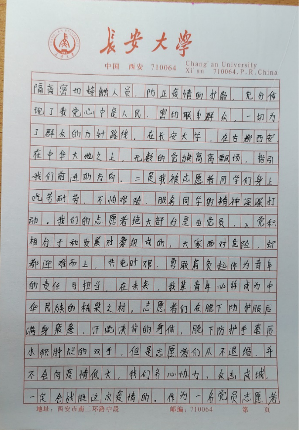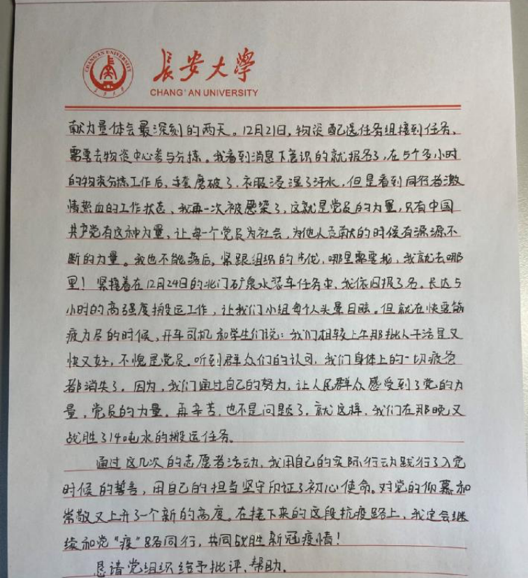 本科生第四党支部正式党员刘铮在思想汇报里表达了对学校的感激和赞扬:面对严峻复杂的疫情,我校严格的校园管控政策,充分保证了全校师生员工的生命健康和安全,最大程度保证日常生活学习,精确做好各项服务保障工作。坚信我们一定可以打赢疫情防控阻击战。