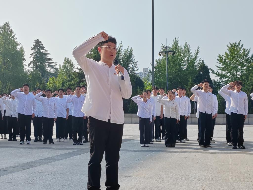 最后,在本科生第一党支部组织委员黄培硕的带领下,全体党员高举右拳,面对鲜红的党旗庄严宣誓。铿锵有力的誓言响彻陵园,既是对入党初心的再次叩问,更是对传承英烈精神、践行使命担当的坚定承诺。